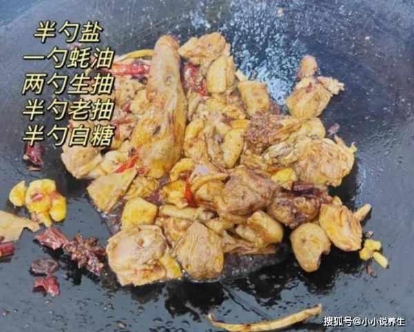 第六步:将焯好的鸭肉倒入锅中。记得用大火搅拌。等到鸭肉慢慢变色。加半勺盐,一勺蚝油和两勺生抽,加半勺就可以了。老抽上色,加入半茶匙糖,快速翻炒一会。