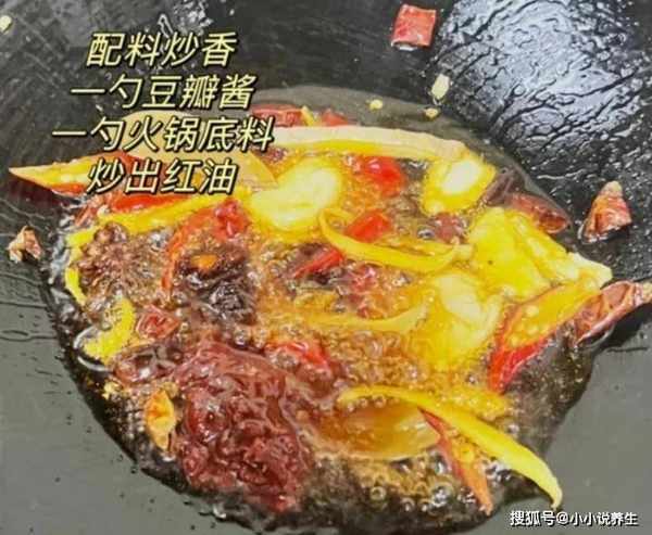 第五步:锅内放少许油,加入一勺红油豆瓣酱,加入一勺火锅底料,加入一些干辣椒和香料,炒出红油和香气。