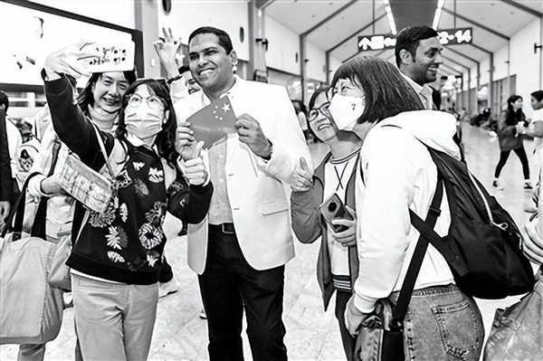 3月1日,斯里兰卡卡图那雅克,中国游客与斯里兰卡旅游部长哈林·费尔南多自拍