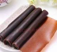 果丹皮,红红的山楂片卷成一卷,可以一口咬下去,也可以把楂卷摊平了从边上开始吃。果丹皮是小时候吃的最多的零食,现在也会偶尔买点,吃着就是乐趣。