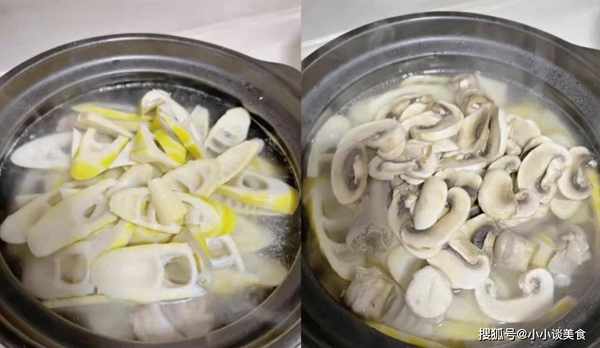 第四步:将鲜香菇洗净,香菇去蒂,全部切片,排骨放入汤锅中,加热水煮沸,加入春笋和香菇,转中小火焖煮。