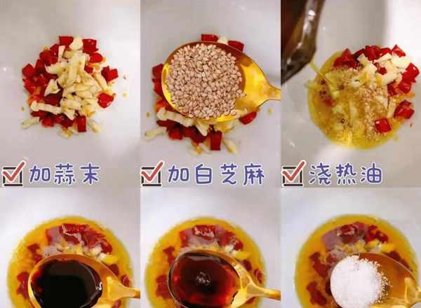 第五步:加入半茶匙鸡精,加少许糖,加香油。喜欢吃辣的可以加入辣椒油,稍微搅拌一下,备用。