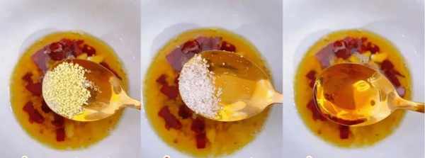 第四步:将食用油放入锅中加热。将所有的热油倒在干辣椒上,加一汤匙生抽和一汤匙老抽,加一汤匙香醋,加盐调味。