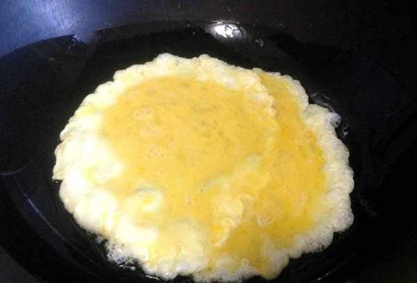 第四步:准备一个干净的平底锅,两面加入食用油,待两面油热后,快速搅拌蛋液,使蛋液全部成蛋液,煎好蛋液,装盘.以后使用。