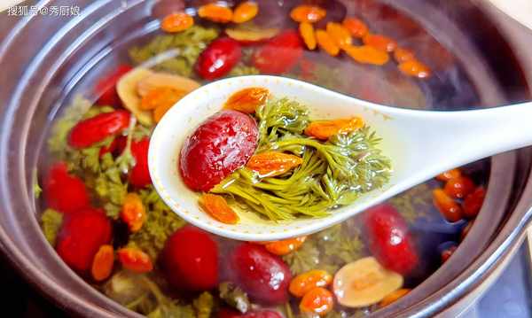 3.将红枣煮软,将冰糖煮化后,关火,打开锅盖,撒上清洗干净的枸杞,搅拌均匀,然后用勺子将汤汁舀入碗中,稍微放凉后,即可食用。
