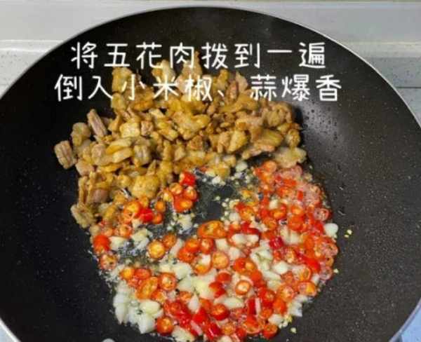 第五:炸好炸好的五花肉,加入小米椒和蒜末,快速翻炒出香味,倒入刺山柑,翻炒片刻。