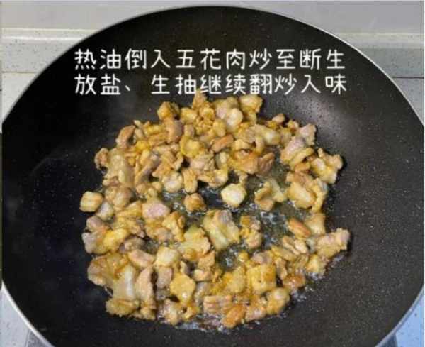 第四:锅底放少许食用油,等油慢慢烧热,倒入五花肉,快速炸出肥肉,加少许盐,加半勺酱油,放入姜片。搅拌均匀。