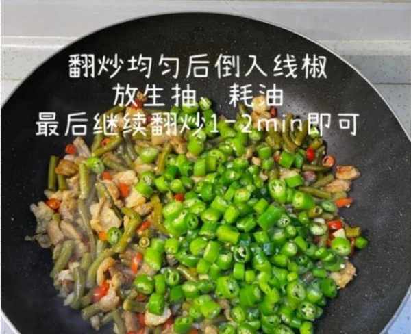 第七:关火,取出锅。这道酸豆豆炒肉就可以吃了。作为配菜非常好。