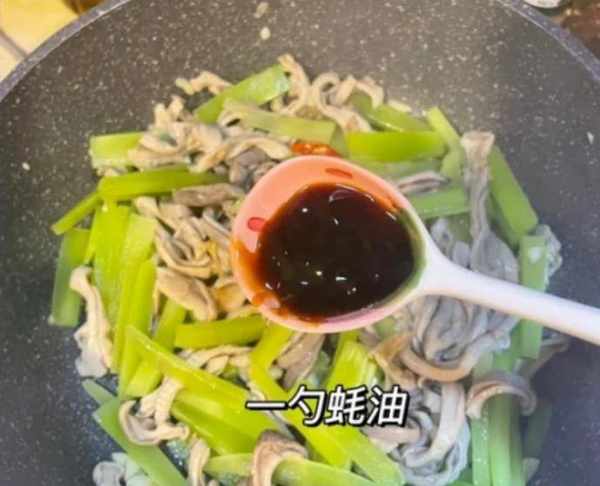 第六步:倒入焯过水的五花肉,翻炒约15分钟。大火2分钟,倒入一些沙拉炒熟,加入一勺生抽,半勺老抽,一勺蚝油,加入辣小米,翻炒几下.