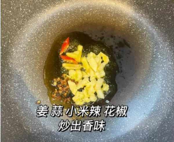 第五步:锅底加少许食用油,放入蒜末、姜末,加入小米椒、刺灰,大火炒香。
