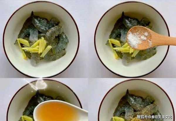 第四步:碗中加入少许姜末,加入少许盐,半勺酱油,加入一勺料酒去鱼腥味,加入少许黑胡椒,将虾预腌入味。