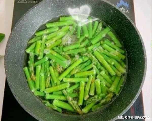 第二步:另锅烧开水,倒入芦笋部分焯水,中间加一勺盐,滴少许橄榄油,焯芦笋20秒左右,芦笋不要焯太久,捞出放入冷水中,检查干芦笋的水分,备用。