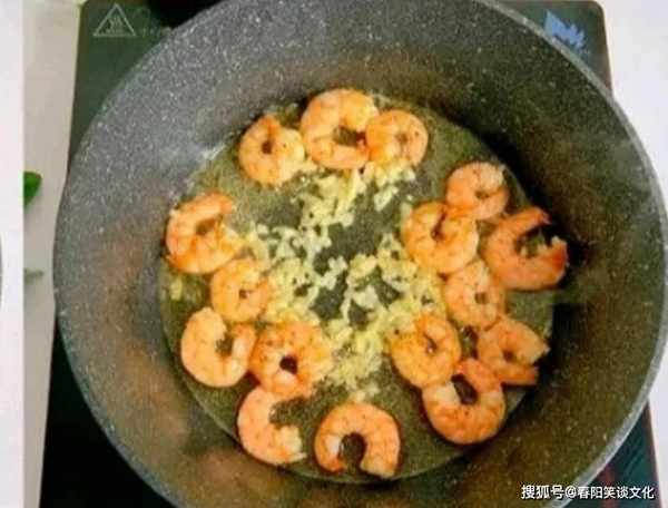 第五步:锅底慢慢烧热,加入适量橄榄油,加入一些蒜末和姜末,倒入虾仁翻炒片刻,然后快速翻炒,让虾仁翻炒片刻一边炒一边变色变色。