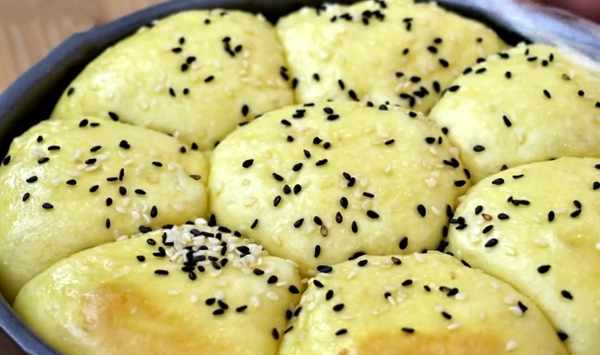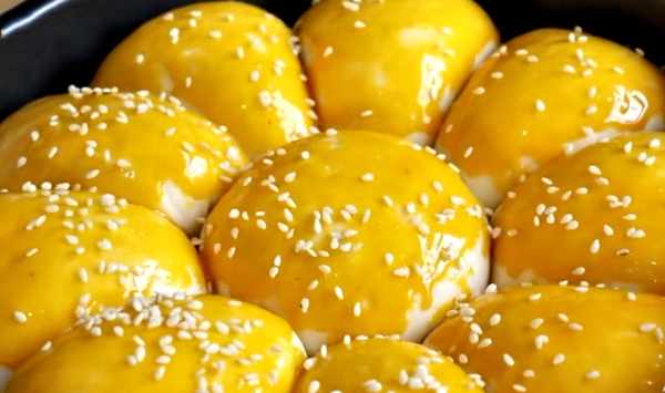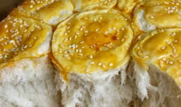 下麵把麵團放在案板上揉搓一會,揉出一層薄膜,再搓成長條,切成一樣大劑子,把每個劑子擀成面皮,放上餡料包起來,再一次收圓,在模具裏刷上一層油,把生胚擺放進去,醒發至2倍大,刷上一層蛋黃,撒上點黑白芝麻,蓋上一層耐高溫保鮮膜,凉水上鍋蒸,水開蒸35分鐘,時間到,關火燜5分鐘出鍋,最後脫模撕成小塊即可食用。