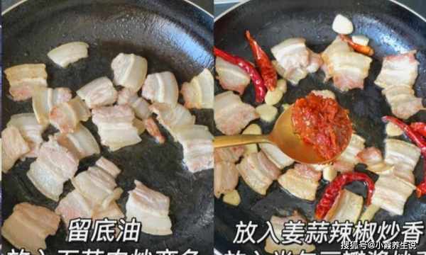 第五步:锅底继续加油,倒入腌制好的五花肉,炒出猪油,稍炒,下葱姜蒜,下豆瓣酱炒香。