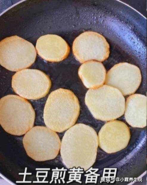 第四步:锅底加少许油,将土豆片铺在锅底,小火慢炖片刻,至微黄,捞出备用。