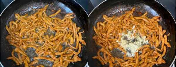 4:锅底刷少许油,倒入少许肉丝,快速翻炒片刻,待肉丝炸至8成熟时,锅底加入切碎的姜蒜,炒香香气很快。