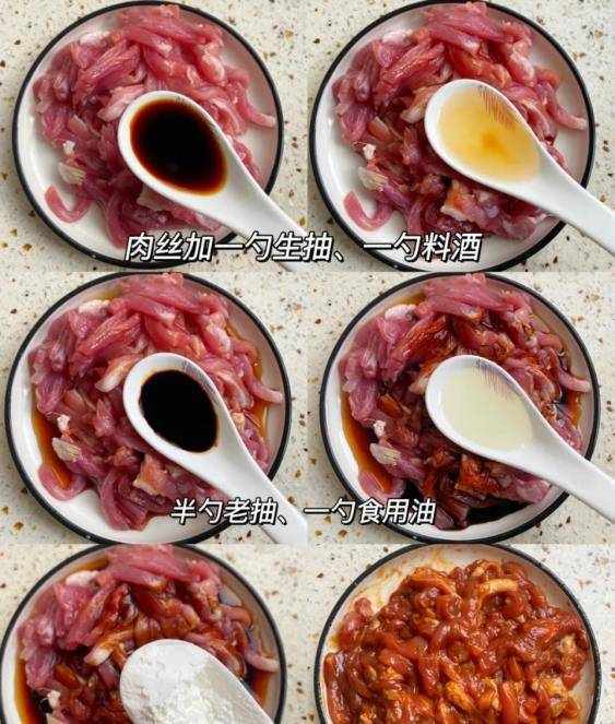 2:将肉丝放入碗中,用料酒去腥,加一勺生抽,加半勺老抽,加半勺淀粉,最后滴入食用油,抓起用手反复,让肉提前腌12分钟。