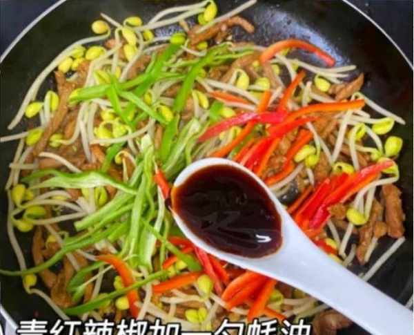 5:倒入一些豆芽,将豆芽炒软,加入一些青红辣椒,将辣椒炒至生,加入一勺蚝油,少许盐和糖,最后加入十三香或花椒。