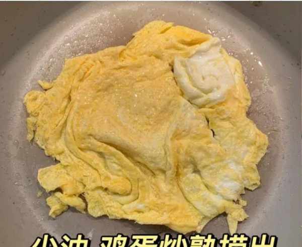 4:锅底刷少许油,油热至50%热度,倒入蛋液煎片刻,鸡蛋用中小火煎,炸成几块,放入。碗以备后用。