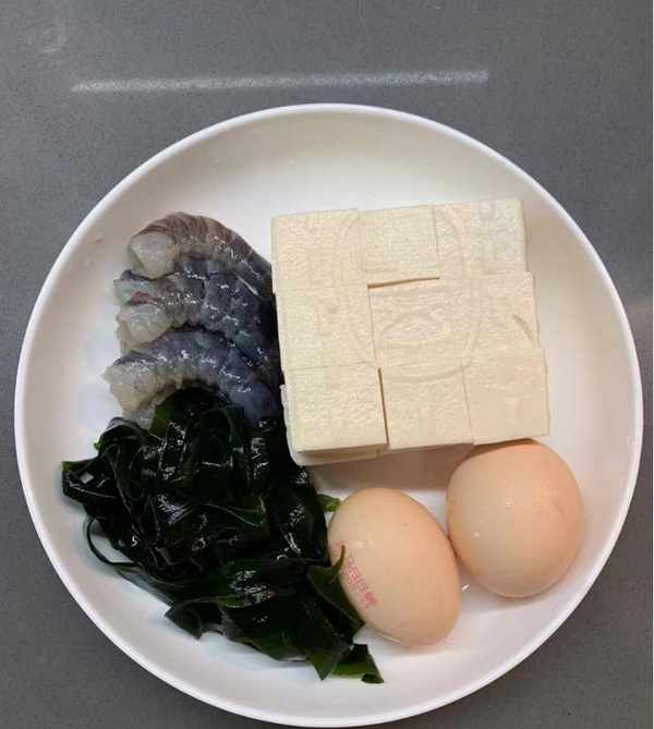 准备一些食材:买100克左右的鲜虾,选80克左右的优质裙带菜(或者选择海带,海带是优质藻类,钙和铁含量高,做汤非常入味),稍微煮一下。酒、酱油两勺、胡椒粉少许、盐、红薯淀粉、开水两碗、鲜味半勺、橄榄油、姜一片、洋葱少许、软豆腐约150克、两个当地鸡蛋,半勺苹果鸡等。