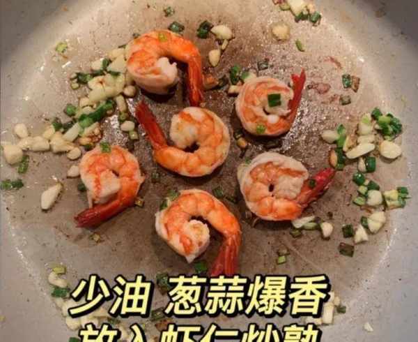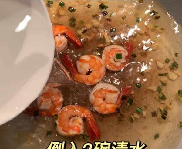 5:锅底继续留油,放入葱姜蒜末,倒入腌制好的虾仁,待虾仁煮至变色,加入两碗开水,然后将汤煮沸。