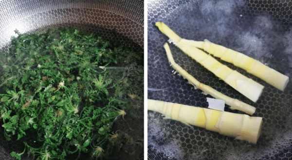 第二步:将春笋去皮,将春笋洗净切条,锅中烧热水,将春笋泡发2分钟,去除春笋中的草酸。发芽,荠菜沥干水分,切细末备用。