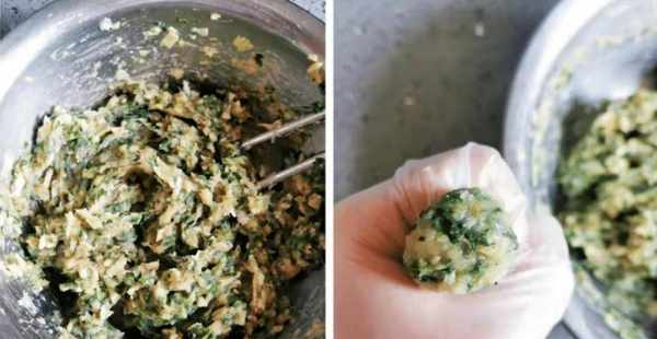 第六步:戴上一次性手套,用虎口把肉馅压成一团,用勺子挤一下荷包鸡脯碗,把荷包鸡脯碗放进锅里。