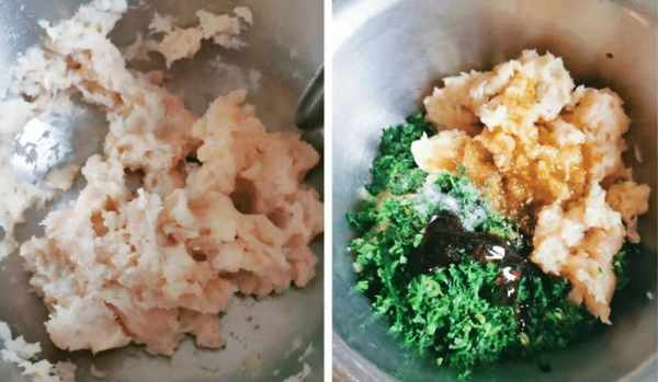 第四步:将鸡胸肉、荠菜、春笋加入,用筷子不断搅拌,用手收紧馅料,加两勺原味酱油,加一勺蚝油,加一勺料酒捞出鱼的气味。