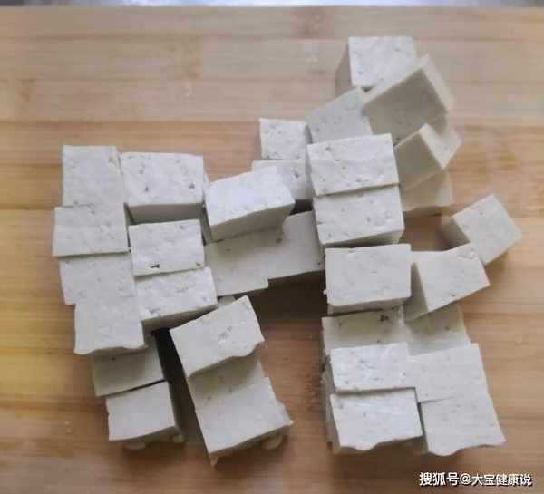 第二步:锅中烧少许水,豆腐块焯水一分钟,豆腐去豆腥味,去水沥干,姜切细条,香葱切葱花备用。