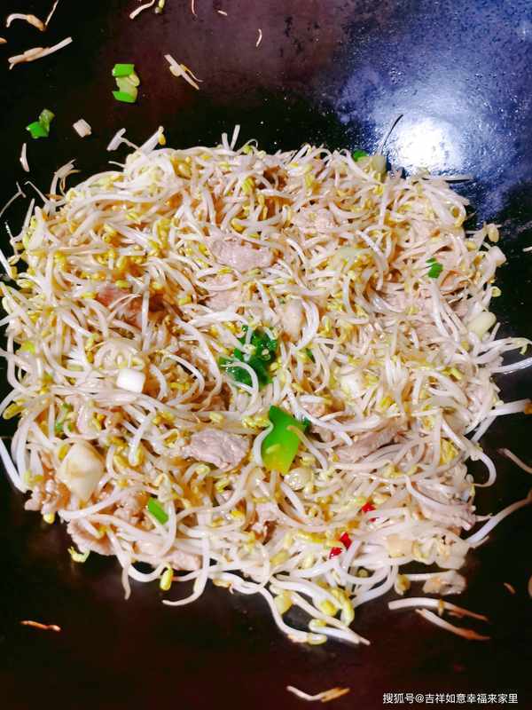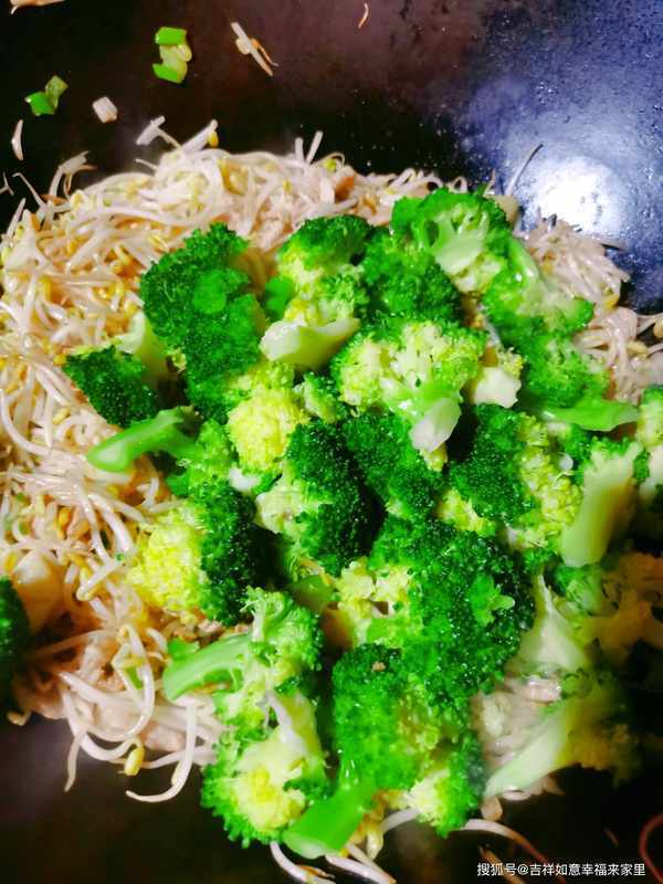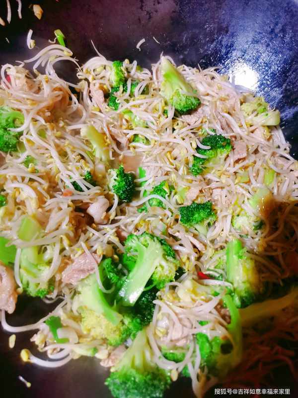 锅中放油,油热后,放入切好的肉片,炒至肉片焦黄,放入葱花,稍微翻炒下,放入绿豆芽,放入盐、十三香、蚝油、生抽、辣椒,一起翻炒,炒至绿豆芽断生后,放入西兰花,一起翻炒均匀,这样一道简单又美味,绿色健康菜就做好了。