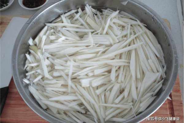 第一步:将几根茭白的根切掉,剥去茭白的叶鞘,将茭白斜切成片,再切成等宽的细丝。干燥的水分就足够了。