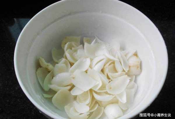 烹调步骤1:将鲜百合去根,然后将鲜百合一一取出,用清水将百合冲洗干净,然后准备一锅清水,将百合煮几分钟,然后用水浸泡。冷水冲12分钟,沥干水分备用。