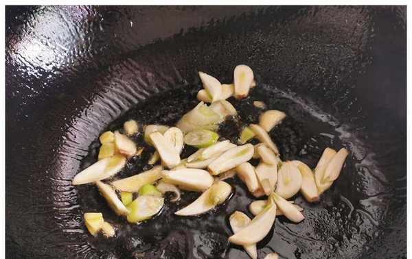 第五步:加入另一半的蒜末。喜欢吃辣的可以加几片小米,中火炒匀,最后提味。