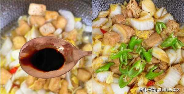 配料明细:买娃娃菜2个(也可以选卷心菜或卷心菜,娃娃菜味道比较甜,很适合炒),猪油渣30克(面渣是猪油用猪油提炼得到的原料),猪油渣通常是用作配菜,用来炒菜很好吃,比吃肉还香),买炸豆腐200克,食用油适量,小米椒2个,大蒜10瓣,小葱三个,水少许,盐和糖少许,生抽一勺,老抽一勺,蚝油一勺,青椒一个,其他调料。