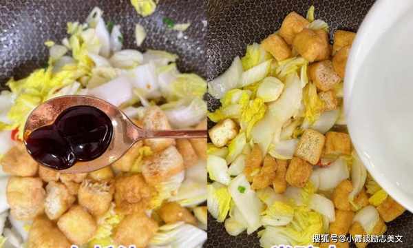 第四步:加入一些剩下的甜甜圈,倒入娃娃菜搅拌至软,然后倒入一些肥豆腐,搅拌均匀。