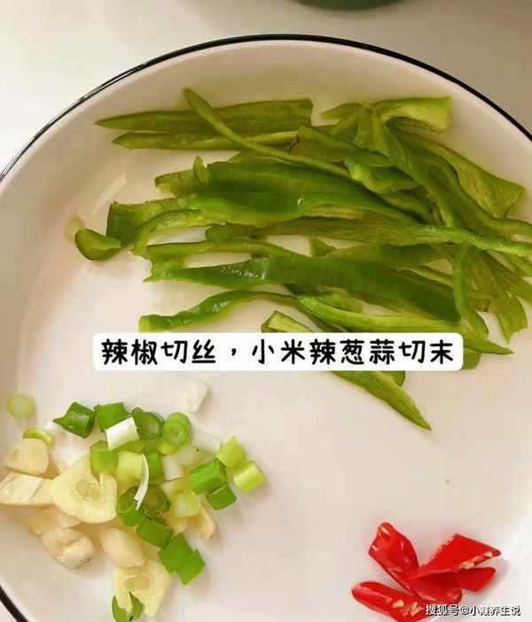 第一步:准备香菇和小菜,先把青椒去白蒂和蒂,青椒洗净切成细圈,小米切成小块,大蒜切成细粒,香葱切段放入切碎的葱中。