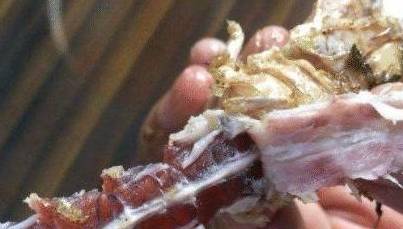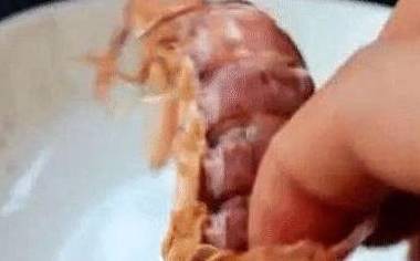 顺着剥开的这个口,其余地方的虾壳儿用手轻轻一拽就掉了,把虾肉轻轻一拉就出来了,几秒钟虾壳就剥干净了,是不是非常简单呢?大家以后吃皮皮虾的时候,找到虾壳上的这个开关,剥开一个关节的虾壳就可以了,大家记住了吗?
