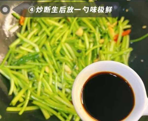 第四步:倒入一些红薯蒂,大火炒至生,加半勺糖,加少许盐,拌入调好的酱汁(一勺极鲜,一勺蚝油,加少许水)
