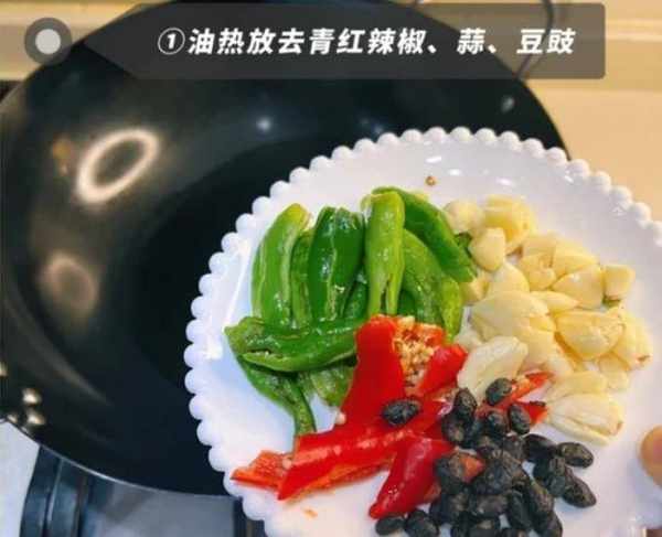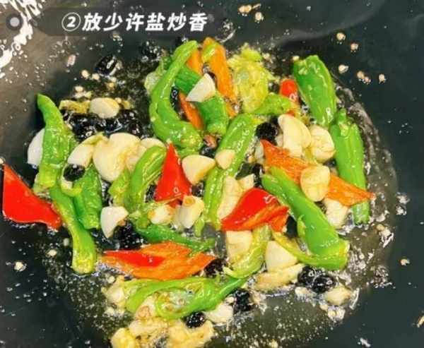 第三步:锅底预热,加入少许食用油,锅中放入青红辣椒,加入一些蒜瓣和豆豉,大火翻炒出香味。