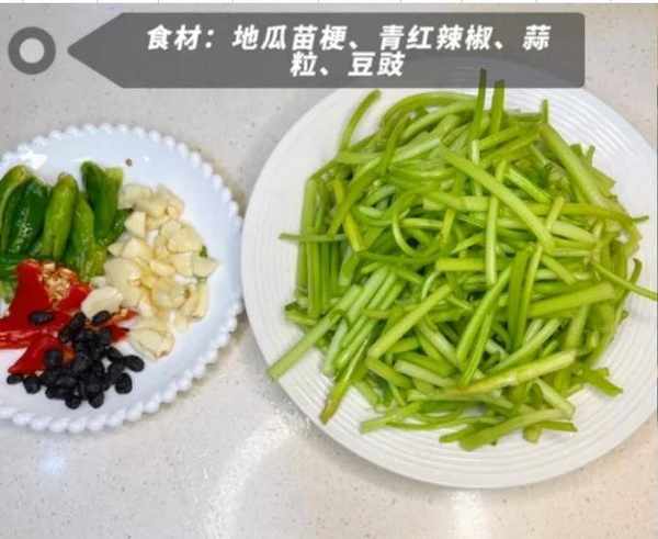 准备一些食材:买500克左右的红薯藤(红薯藤是红薯苗的弱点,红薯叶和根都可以吃,荤素搭配,红薯茎很脆,根也很脆纤维含量高,能快速帮助肠子蠕动,夏秋两季一定不能错过这种食物),红辣椒一个,青杭椒几个,豆豉少许,大蒜几个头,水少许,植物油、盐少许、糖半勺、生抽一勺、蚝油一勺、鸡精半勺、味精半勺、其他调料。