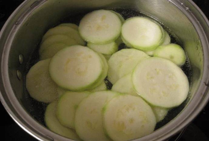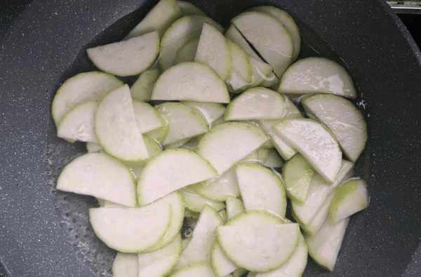 5:锅底烧热,加入上层姜末和百叶窗炒香。记得烧开一些热水,然后加入西葫芦煮几分钟。