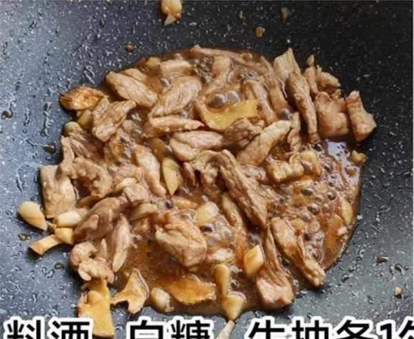 第五:倒入一些肥肉翻炒肥肉,加入瘦肉快炒,让瘦肉炒至变色,也可以加半勺料酒去腥,加入黑酱油上色。