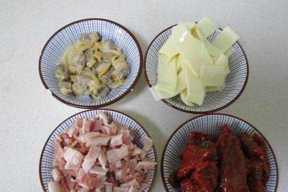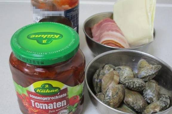 2.发面的时候,就准备做馅料。买蛤蜊的时候要挑选已经养过吐尽泥沙的,买回家后再清洗干净,备好培根,马苏里拉干酪片,番茄沙司和腌番茄。