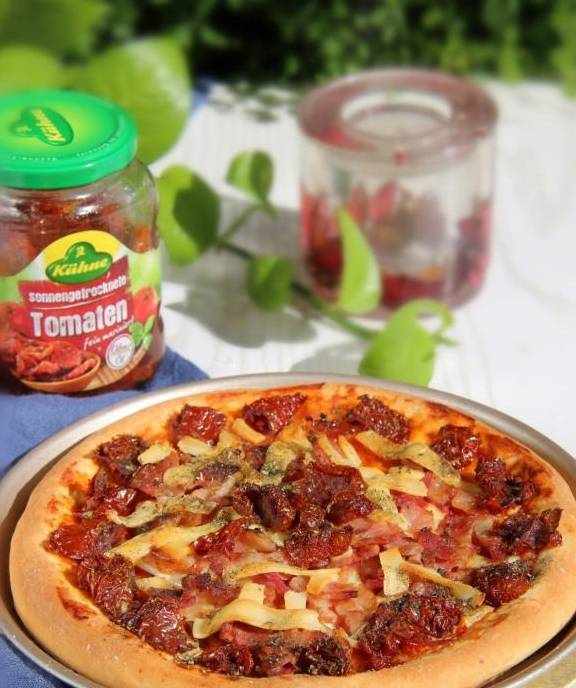 7、再加入一半马苏里拉干酪后把蛤蜊肉和培根碎,最上面把剩下的干酪条全部加上,围着饼皮把腌番茄加上,多余的加入中间后再把罗勒香料均匀的加在上面。