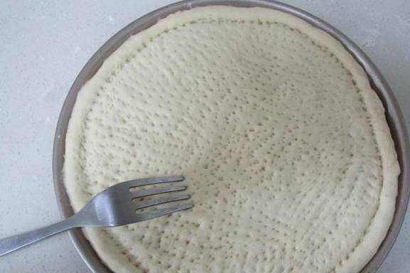 5、发酵好的面团揉光排气后盖上保鲜膜静置20分钟,之后擀成面饼放进披萨盘里,整形好后用叉子扎满小孔,防止饼皮在烤制的过程中凸起。