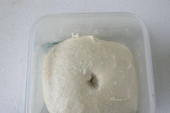 1,、先把面团发酵好,我用厨师机搅拌的,搅拌桶里倒入清水,盐和白糖,再把高筋面粉倒入后加入酵母搅拌至光滑后再倒入橄榄油一直搅拌至光滑的面团后放入保鲜盒里加盖发酵至二倍大。28度大约1小时左右。