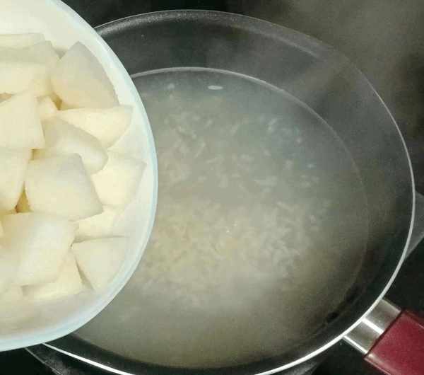 第五步:另取一锅加水烧开,加入酒酿稍煮,倒入切碎的雪梨,煮至呈半透明状。