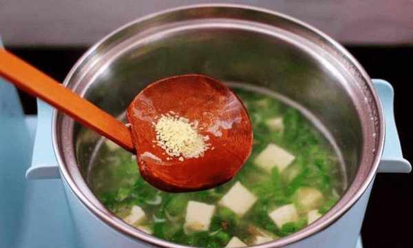 第七步:然后一点点加入盐和一小勺鸡汤,少许鲜味,搅拌至顺滑,待荠菜豆腐鸡蛋汤入味后,撒上葱花,这道美味的荠菜豆腐鸡蛋汤就是准备好。