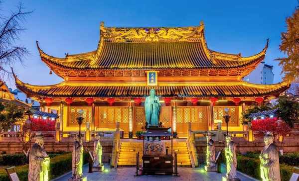 1、大成殿门前的孔子雕像:照亮了全身,显得更加神圣。